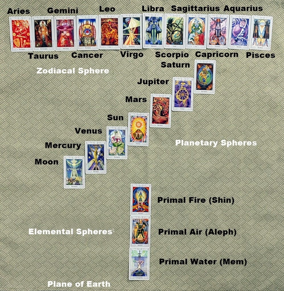 AUTHOR’S NOTE: In Tarot Magic, Donald Tyson described a hierarchy of tarot trumps based on a Kabbalistic cosmology that places the Earth at the bottom as fixed and unmoving; the three “Primal Elements” (Water, Air and Fire in ascending order) as the first three increasingly-subtle “spheres” one encounters when rising from the Earth’s surface; the seven traditional planets arrayed in concentric circles from fastest (Moon) to slowest (Saturn) representing the spheres in the middle zone; and a single outermost sphere segmented into the twelve signs of the zodiac. He explained these as “archetypal gates” by which ritual tarot magic can aspire to perfect realization.