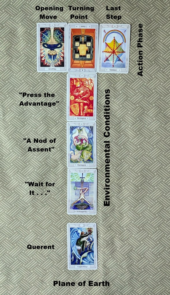 Finally, treat the four elemental suits of the Minor Arcana as a “pool” from which to extract three cards showing the progression of events or circumstances that will emerge from the background theme furnished by the chosen series of trumps. (I do apply reversals here to indicate whether any proposed actions should be covert instead of overt.)