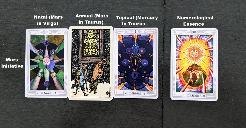 For this example reading I selected the aforementioned Mars initiative. My natal Mars is in the second decan of Venus in Virgo, represented by the 9 of Disks (Gain); the position of Mars on my 2024 solar-return date (aka birthday) was in the first decan of Mercury in Taurus, shown here by the RWS 5 of Pentacles or alternately by the 5 of Disks (Worry) in the Thoth deck; for the random topic card I pulled another instance of the 5 of Disks, doubling the anxiety level that was already high enough. Even before I drew the last card, prospects for success in physical pursuits looked dim, implying frustrated ambition, and the second Five put the nail in the coffin. However, all is not bleak since the Sun as the “numerological essence” suggests that I should “wait until next year” when my chances could be better. Solar-return Mars for 2025-26 will be in the first decan of Sun in Virgo, not far from my natal Midheaven, which relates to the 8 of Pentacles or Disks, a much more productive combination.