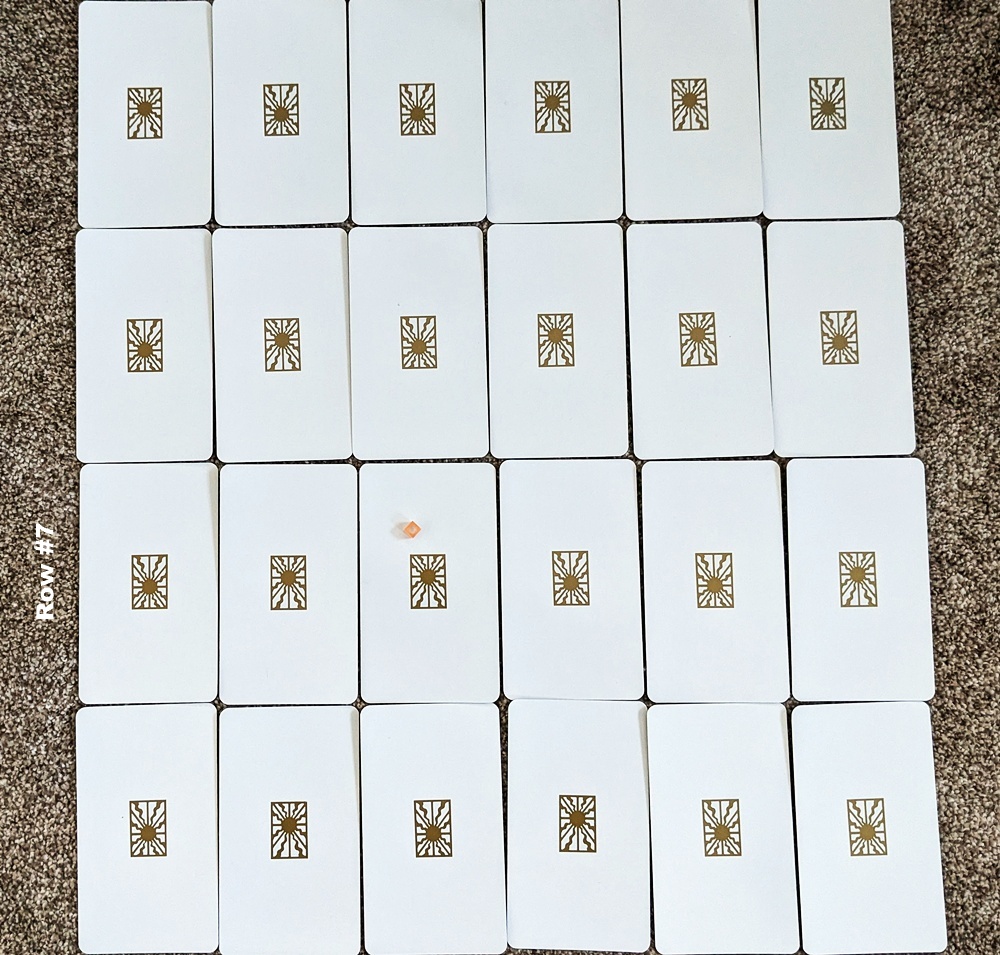 Next, randomly select one of the rows for interpretation. You may come up with another method, but the one I chose was to cast a small, lightweight token of some kind onto the layout. (I use a plastic bead that won’t scatter the cards when thrown onto them.) My original thought was to have a “backsplash” – the black barrier in the photo – off which to bounce the token (like the crap-shooter’s wall in back-alley gambling) so it could conceivably rebound across the whole pattern. But in practice it kept landing on one of the top three rows because it was too light, so I changed my mind.