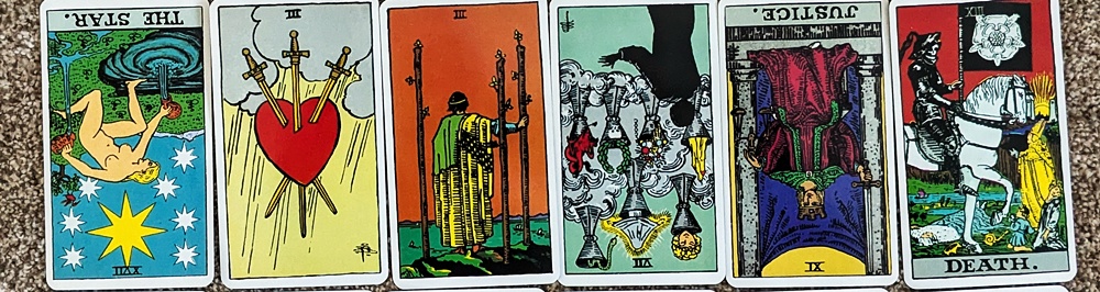 This is a moody reading that suggests “dashed – or perhaps unrealistic – hopes” (Star reversed); anxiety (3 of Swords); patience (3 of Wands) that goes unrewarded (7 of Cups reversed); and a “stay” in the verdict (Justice reversed) that remains “on hold” until something ends (Death). I see a “to be continued” message here.