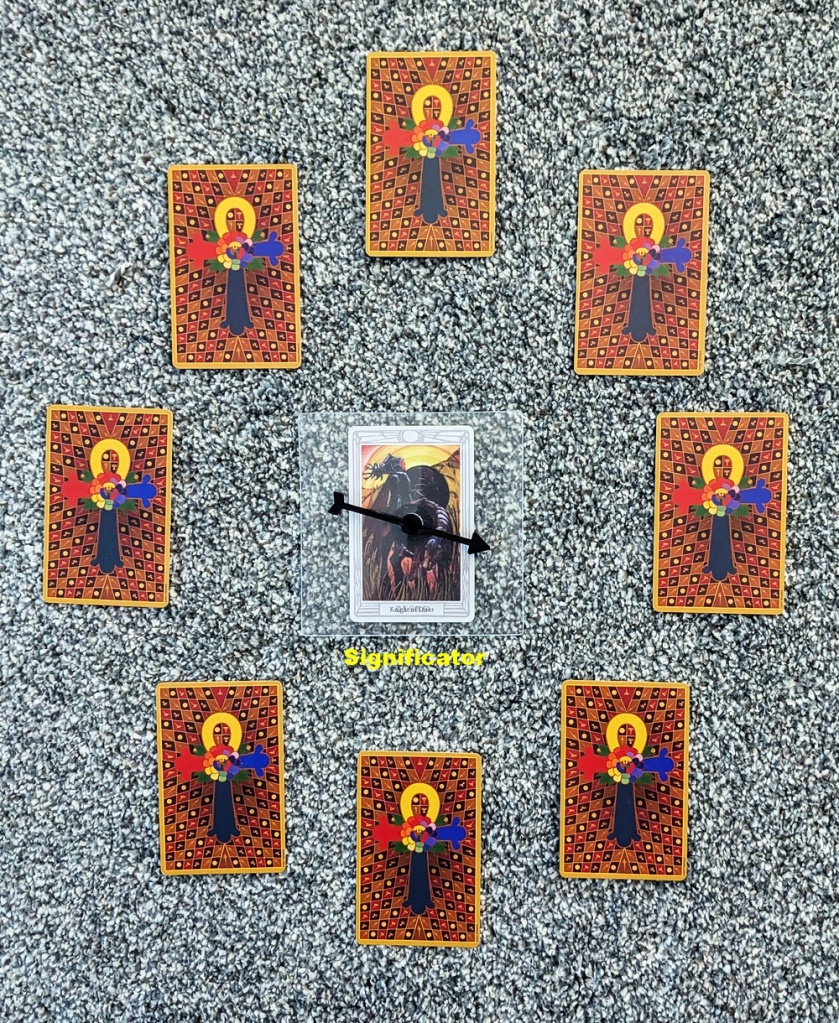 Place a board-game spinner on top of the Significator such that the pointer has an equal chance of landing on any of the eight surrounding cards. Give the pointer a vigorous spin and note which card it stops on. Turn this card face-up to show the direction in which the search should be initiated.