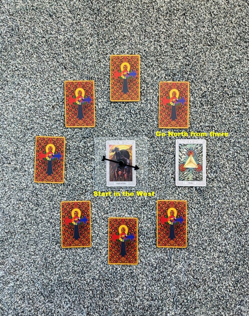 Reshuffle the deck, allowing for reversals, and deal twelve face-down cards counterclockwise from the left in a circle around the central pair to emulate the astrological sign-and-house array. In the “natural” (or Aries-rising) horoscope, the 1st House at the left specifies East; the opposite 7th House shows West; the 4th House at the bottom conveys North; and the 10th House at the top stipulates South.