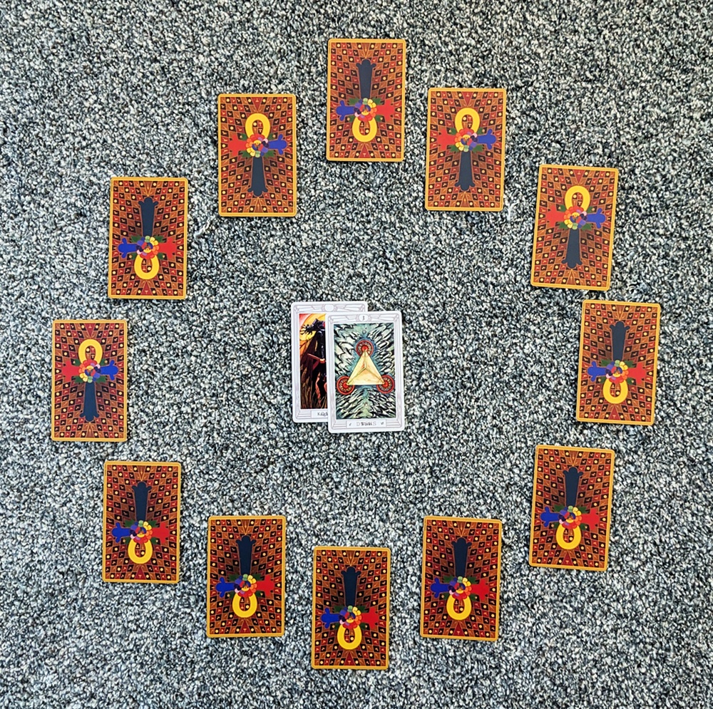 Remove this card and the Significator from the pattern, pick up the rest of the cards, and place the pair in the center of the table with the Significator on the bottom.