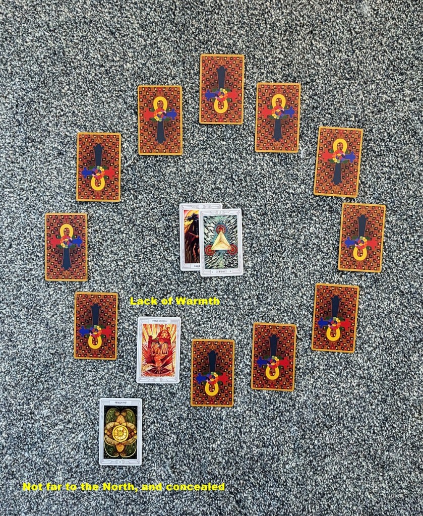 The example used here was for the known situation of a 65-year-old man (the Knight of Disks) who was last seen walking away northward from a medical facility and who was found deceased near a turnpike on-ramp a few weeks later not far to the North of his last known location. His body had apparently been concealed by snow and wasn’t visible until it melted. (My previous reading proposed that he had gone West rather than North, which turned out to be incorrect.) The two Earth cards here both indicate “to the North,” while the Ace of Disks reversed in the 3rd House is a clear sign that he was both not far away in that direction and hidden from sight. The Prince of Wands in the same North-Northeast position conveys the idea of “in the neighborhood but not right on the doorstep,” and its reversal intimates that he suffered hypothermia due to being buried in snow, which led to his demise.