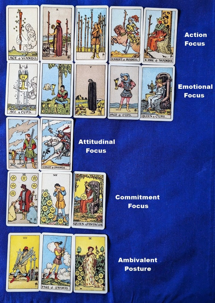 Fifteen of the 56 cards exhibit a leftward “facing,” implying a focus on unfinished business from the past that is still churning in the querent’s subconscious. Wands are related to questionable actions that may still be regretted at the time of the reading; Cups to lingering remorse over emotional turmoil; Swords to unsound ideals or beliefs that have overstayed their welcome; and Pentacles to halfhearted commitments made but not fully endorsed. The three ambivalent cards will be addressed later in this essay,