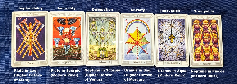 AUTHOR’S NOTE: A while ago I pegged the three modern planets of astrology – Uranus, Neptune and Pluto – to the Chaldean wheel of correspondences used by the Hermetic Order of the Golden Dawn to align the Minor Arcana of the tarot with the 36 decanates (or “decans”) of the zodiac. In doing this, I replaced one instance each of Mercury, Venus and Mars with its “higher octave” counterpart (so-called in esoteric astrology) in the order shown above, and one instance each of Mercury, Mars and Jupiter with the modern ruler of its decan’s astrological sign: Uranus in Aquarius, Pluto in Scorpio and Neptune in Pisces, respectively. With thirty additional instances of the seven “classical” planets to work with, there may be more opportunities for experimentation but these six stood out. The original experiment is linked below.