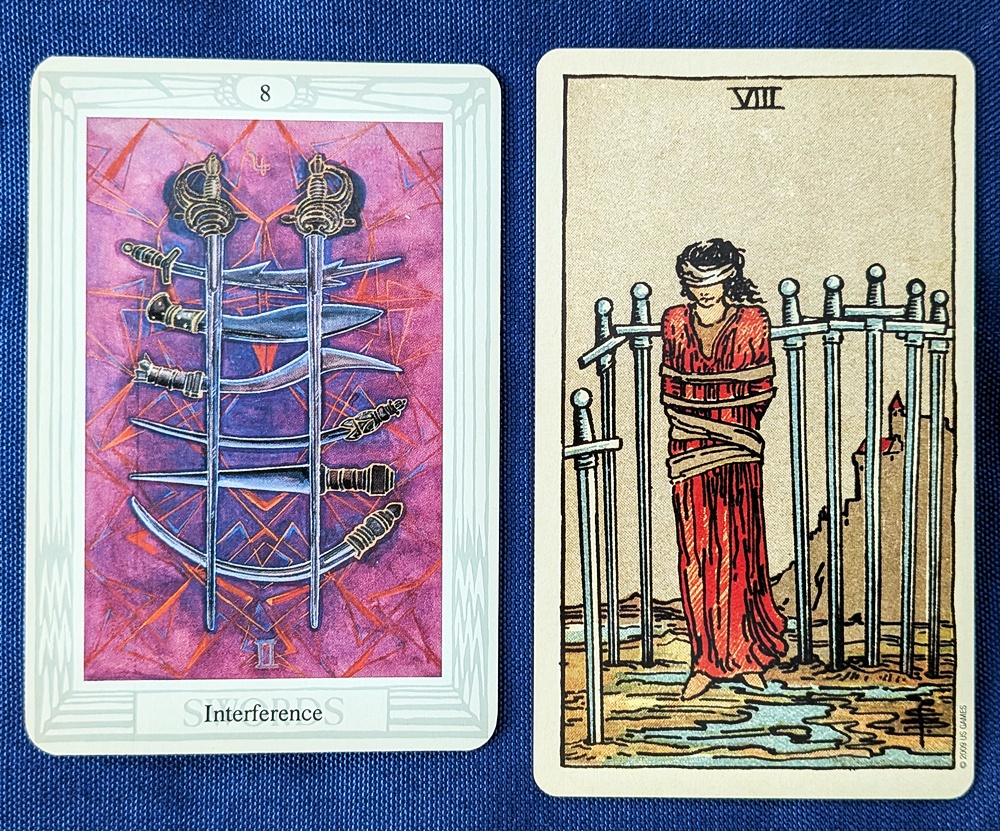 As the saying goes, “The magic isn’t in the cards, it’s in the reader.” I’ve always believed that any human qualities that might be attributed to them are in fact only a reflection of the the artist’s ability to evoke a sympathetic response in the mind of the beholder. We see what we’ve been conditioned to see, although I think the Thoth deck “breaks the mold” in this regard. Harris nailed Crowley’s vision to near-perfection. This distinction can be seen clearly in the 8 of Swords, “Interference.”