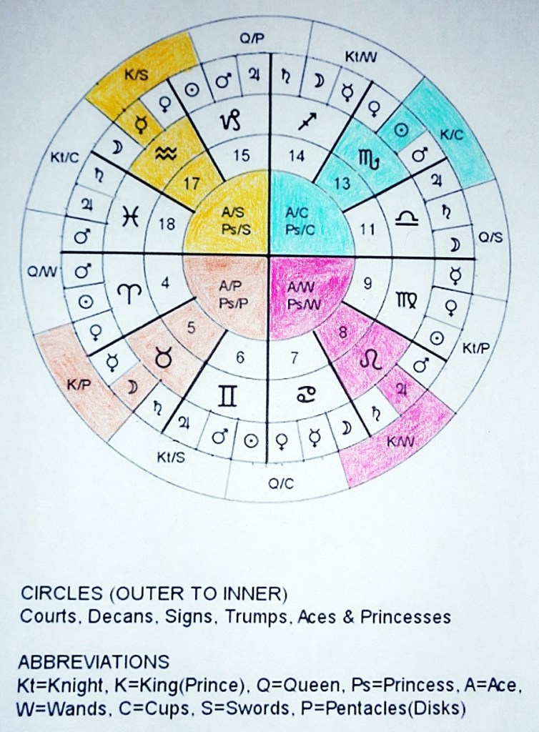 Each Princess is described as the “throne of the Ace” but, given the dynamic nature of the tarot, I can’t envision this as an exalted “dais” upon which the Ace languishes, sipping tea and nattering with its consort. I think of it as the generative womb of the Princess from which the Ace is propelled outward in an act of birthing that drives it toward the rim of the wheel where the rest of the small cards and the associated court cards await its stimulus. Its arrival suggests a trigger that energizes and motivates the entire quadrant. I once created a “tweaked” graphic that shows this relationship.