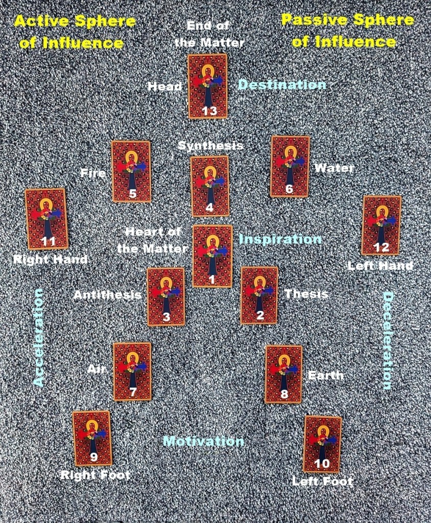 This spread originates with a single card at the center representing the “situation as it stands.” It is ringed by a three-card tier that can be applied as the “Hegelian dialectic” of thesis, antithesis and synthesis (or “action, reaction and resolution”) leading to a third level of realization in a surrounding “square” that projects the conceptual analysis into a penultimate vision of the outcome, a four-card tableau that prefigures the “end of the matter” as expressed in a five-card pentagram casting the answer in human terms of realistically achievable results.