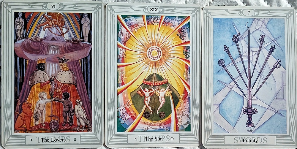 With the preponderance of two trump cards and the Lovers as the lowest-numbered of them corresponding to Air and Mercury, I would go with six to nine more months beyond the target date (which was already well over a year in the past) until resolution of the matter. (The Sun displays higher energy but Mercury is swifter.) The 7 of Swords is outranked by the two trump cards, but it is the second of two Air cards in the spread, backing up the testimony of the Lovers and locking in the prediction. Regarding the cards themselves, the Lovers suggests that an important decision will be made that has high hopes attached to it (Sun), but it isn’t likely to go anywhere with the 7 of Swords (Futility) at the end. The best that can be said about this scenario is “It will be fun while it lasts, but then reality will kick in.”
