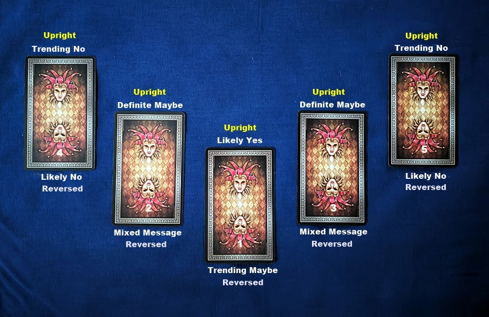If the Significator is not present, keep dealing in the same sequence until it appears in one of the positions either upright or reversed. The position meanings and the impact of orientation should be self-evident, but a brief explanation is in order. The “trending” indicators show that the matter is in flux and moving toward the next less-affirmative status. Only the “Maybe” positions exhibit no incipient trend since they are inherently uncertain regarding the direction the situation may go. I’ve used the “Definite Maybe” oxymoron to describe a “no-decision” verdict when the Significator is upright and “Mixed Message” to show the even more unstable scenario caused by reversal that could slip back into “yes” territory (although I wouldn’t count on it) or degrade into “no.” These are the most cautionary positions in the spread since they can produce undue optimism or pessimism due to their ambivalence. As always, depending on the question, a “no” answer may not be bad nor a “yes” answer entirely good.