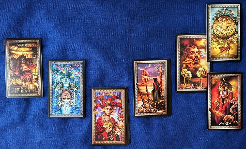 Here is a brief example reading to illustrate the process. The question was whether emotional closure and mutual satisfaction would be achieved in an interpersonal scenario. The 4 of Cups was selected from the Tarot Grand Luxe as the Significator.