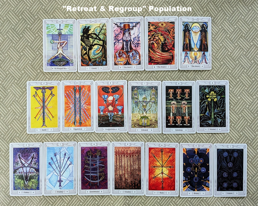 As is usually the case in a random pull, we are going to receive mixed messages involving cards from all three groups. From the standpoint of actionable advice, I would focus primarily on those that appear late in the reading, such as in the “final outcome” or “long-range consequences” position, and secondarily on any that play an especially critical or sensitive interim role, as customarily signified by the “turning-point” or post-crisis “check-and-adjust” position in a line spread.