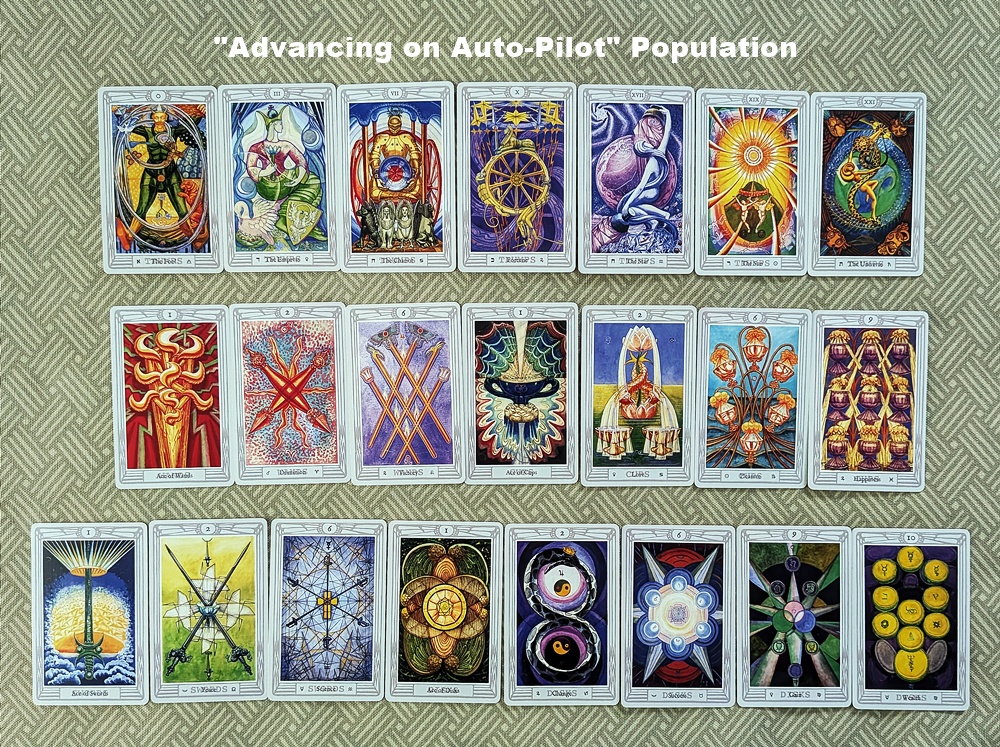 Before anyone comments, I’ve placed the Fool and all of the Aces in the “auto-pilot” population for a similar reason: the Fool is the archetypal nonentity who has no fixed agenda in mind, while in the minor cards coordinated movement doesn’t occur until the Twos appear. (I’ve expanded on the Twos below.)