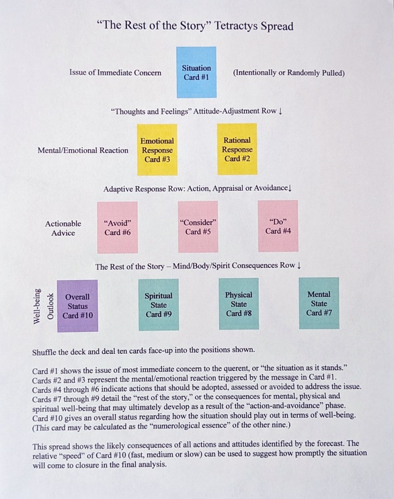 Some time ago I created a 10-card “tectractys” spread for Lenormand reading, and I decided to adapt it for the present tarot-based essay. This is a dual-purpose layout: the first six cards are all that are needed to cover what most clients want to know, which is “What should I do in this situation?” while the last four positions give a broader philosophical perspective (aka “the rest of the story”) on consequential “mind/body/spirit” well-being subjects that may arise from direct resolution of the matter. For brief public readings I would use only the abbreviated format, but if time is not a consideration I would cover all ten positions. (Reversals may be used with this spread.)