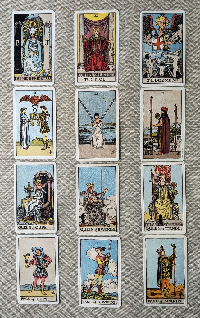 By a further stretch of the imagination, I see the Queen of Cups, also signifying Cancer, as the “little sister” of the High Priestess and therefore her understudy. The judgemental Queen of Swords, with her Libra placement, exhibits a degree of integrity second only to that of the Lady of Justice, while the imperious Queen of Wands is linked to Aries and might be construed as the “handmaiden of Judgement,” or maybe “prosecutor in the Court of Last Resort” is a better analogy.