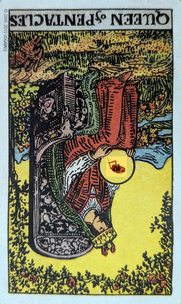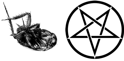 AUTHOR’S NOTE: During the late 20th Century, a common way to express utter futility was by citing the “dying cockroach” analogy and invoking the image of a roach with its legs waving feebly in the air, unable to right iteslf and scuttle away to safety. In tarot terms, the pentagram symbol appears in many of the cards (notably in the Waite-Smith suit of Pentacles and in the RWS Devil and Thoth Hierophant trump cards). Except for the RWS Devil and a few of the Minor Arcana in the Thoth deck, all of which portray an inverted pentagram, these emblems are usually displayed with a single point uppermost, an orientation that was interpreted to convey the supremacy of Spirit over Matter (in other words, a good thing).