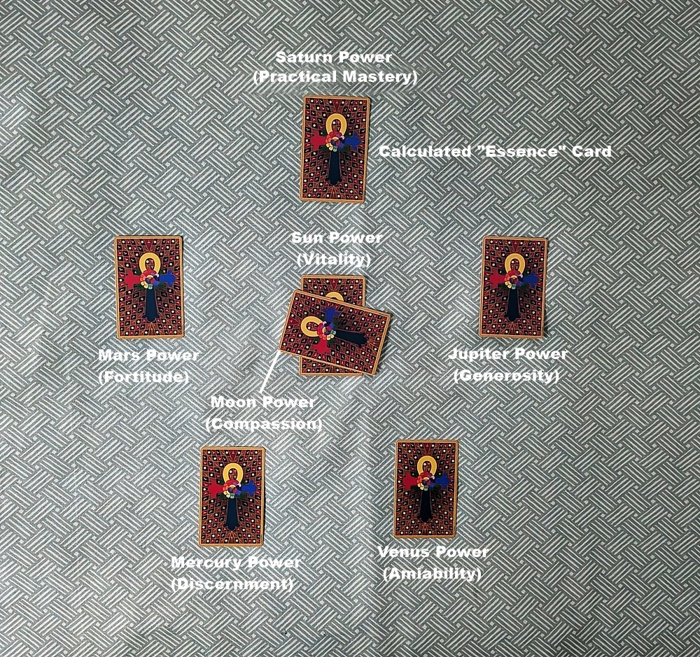Except for the “Saturn” card, this array can be pulled in any order; in my own practice I will follow the astrological sequence in most cases: Sun, Moon, Mercury, Venus, Mars, Jupiter. The Saturn card is to be calculated last as an archetypal “essence” by summing the face values of the other six cards and reducing the total as necessary to come up with a trump card showing overall “worldly” competence.