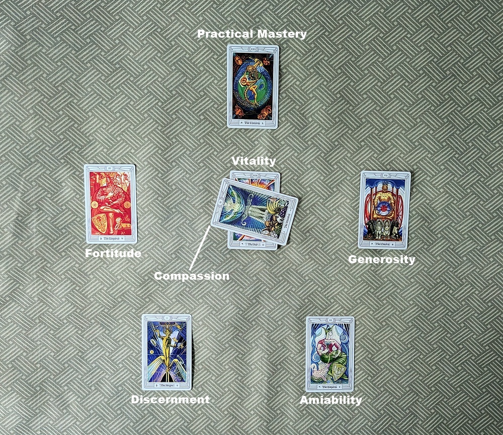 The position meanings are self-explanatory based on the titles, and the relative prominence of any of them can be elevated if the random cards that land there are favorably attuned to their vibration according to various forms of “dignity,” or commonality of element, number, planetary signature or inherent nature. For example, “Mercury Power” exhibits the qualities of Air, the number Eight, astrological Mercury, and the faculties of intellect, so a card of similar nature that falls there would bolster those properties in the profile, creating what I think of as an “isometric” character map of greater and lesser promontories.