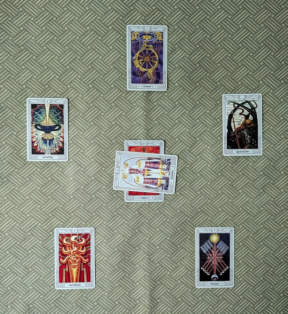 While shuffling the cards, I told the deck “Let’s be critical, shall we?” This is an attitude with which the Thoth tarot has absolutely no problem. I attempted to use reversals but it created a chaotic picture so I turned all of the cards upright.
