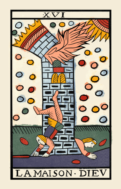 Here is a miscellaneous collection of rudimentary “one-liners” for each of the 22 trumps that captures my current thinking on their divinatory meaning. Many are standard but some will have to be vetted more thoroughly in practice, and I expect they will grow a little since my only purpose at this point is to set the tone for each one (although with La Maison Dieu I couldn’t resist having a little fun). Once again, thanks to Shell David for allowing me to use images from his personal Noblet TdM for online publication.