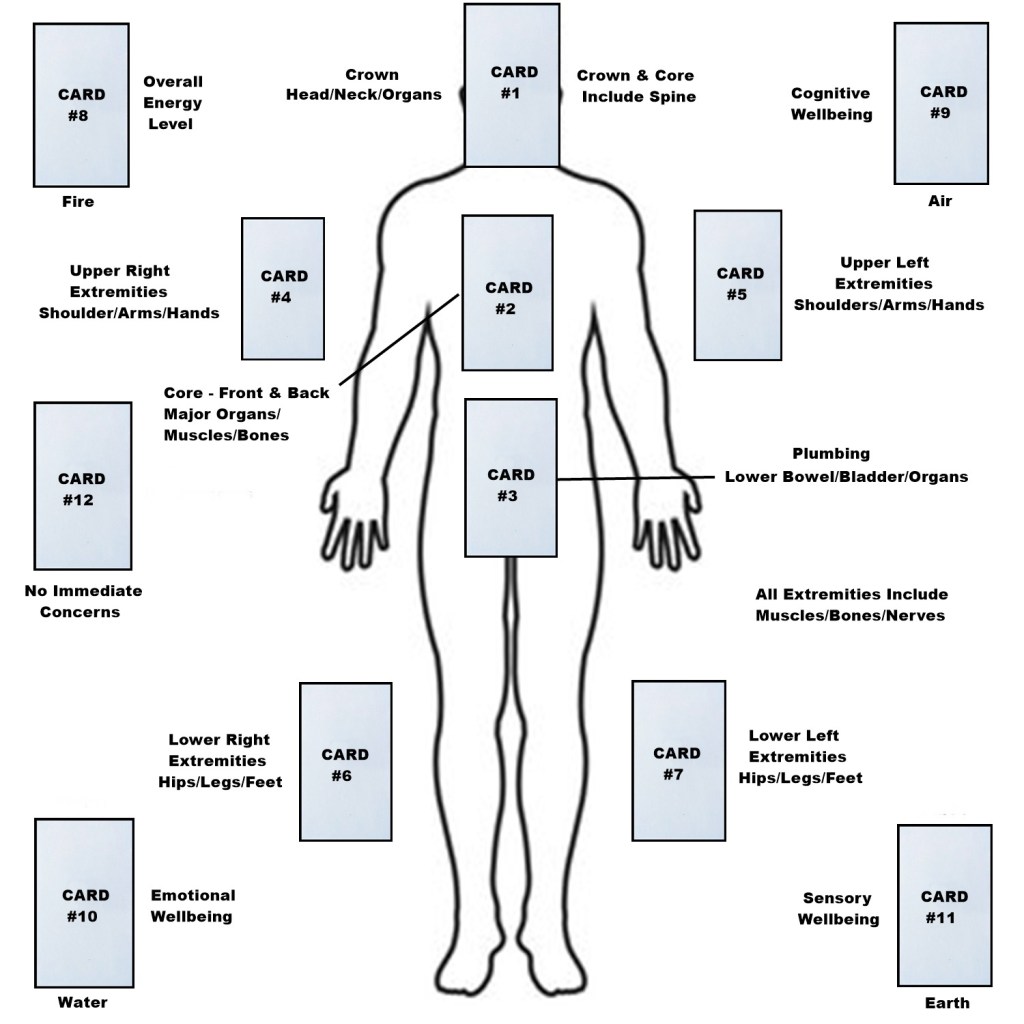 Here is a spread that takes it one small step further and identifies “zones of vulnerability” that might warrant increased awareness from a maintenance standpoint if the reading flags them. No specific advice is offered about what to expect, nor should it be. The idea is to promote prudent attention to high-risk areas. It also includes an indication of “No Immediate Concerns” (Card #12) if that happens to be the outlook, and four broad elemental wellness categories (Overall Energy Level, Cognitive Well-being, Emotional Well-being and Sensory Well-being). I would put it to the querent as “Your subconscious awareness of your personal well-being is pointing toward this area of potential interest.”