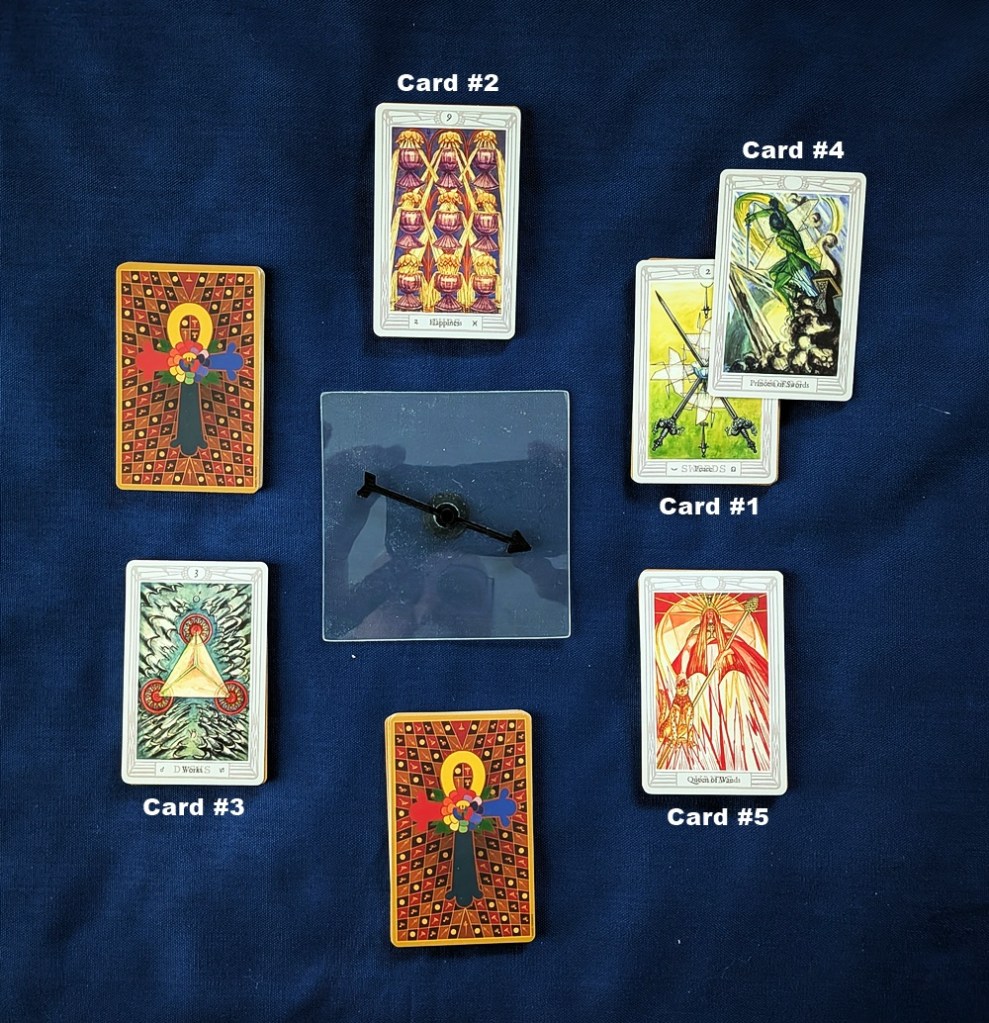 I’ve posted a number of essays on the subject in the past. Here is another spread that enlists a board-game spinner in choosing the cards for a reading.