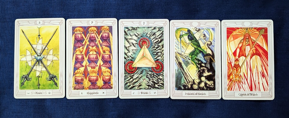 Here is the final spread. (I didn’t get any reversals in this one.) For some strange reason, I can hear The Beatles singing “We Can Work It Out.” Although I didn’t have a specific question in mind for this example, it does suggest an opportunity to make headway after a slow start. That Queen of Wands seems “ready for anything” and the resources appear to be available, but the Princess of Swords is elementally hostile to the 3 of Disks and may be hard to motivate. She has the look of a “Quality Control inspector” to me, but then I should know since I used to be one a long time ago.