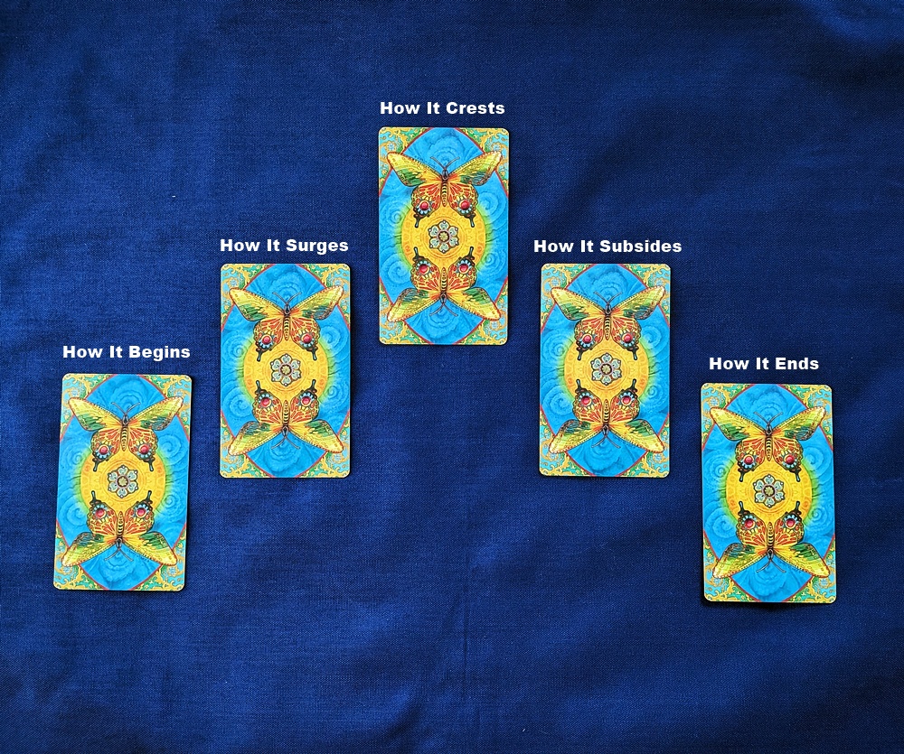 Here is a new spread to illustrate my point, followed by an example reading. I’m also toying with the idea of inverting the “wedge” for matters that have been trending poorly and rename the positions “How It Forms; How It Falters; How It Troughs or “bottoms out;” How It Rebounds; How It Recovers.” (All images are from the Chrysalis Tarot, copyright of US Games Systems Inc, Stamford, CT.*)