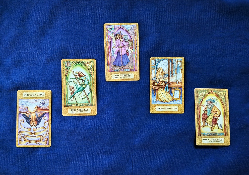 The question involves a situation that has been dormant for some time, and every so often I do another reading to see whether (and how) it might progress in the future. (Note that in this deck the suit of Scrolls equates to Swords, Stones to Pentacles, Mirrors to Cups and Spirals to Wands.)