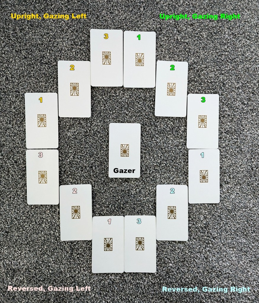 Reveal the center card and follow the gaze of the figure in its upright or reversed orientation to select three cards in the subgroup defined by its facing. Read these cards in a clockwise direction as a three-card arc. (The numbers on the cards show the proper sequence.)