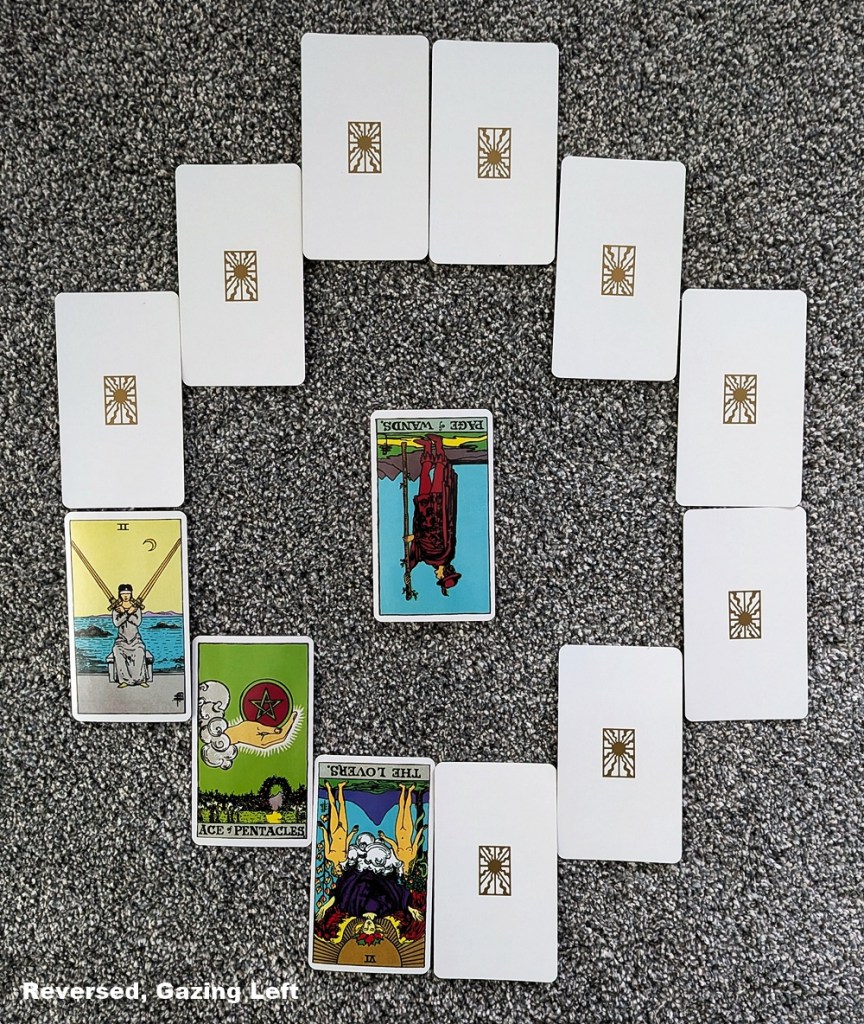 Although I didn’t do so for the example pull, another option would be to also look at the three cards directly opposite the focus of the gaze to consider what is not being seen in the situation that may be more important than what is visible. I never use the “shadow card” in my work, but this approach suggests the risk of being “blindsided” and may be a useful addition to the reading. There is no harm in being forewarned of the possibility.