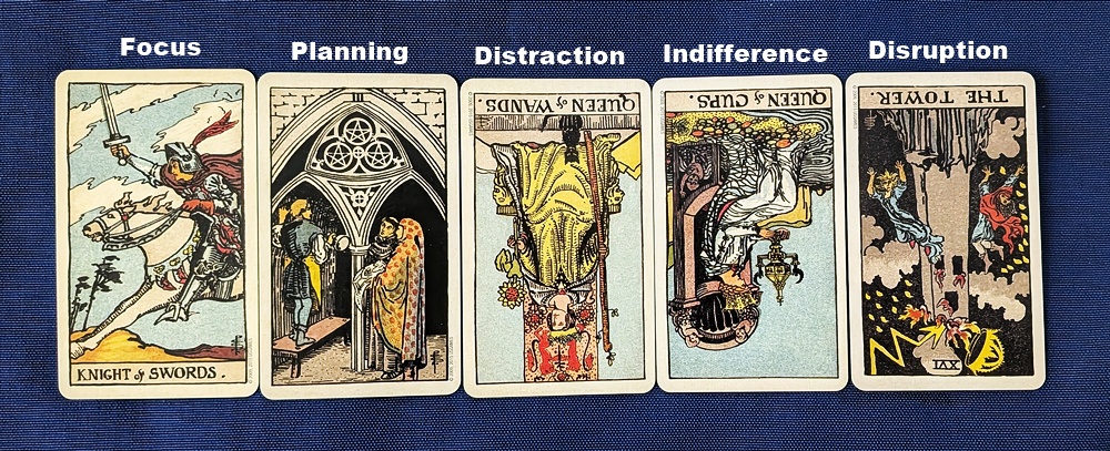 Below is a five-card example reading illustrating the technique. The pointer landed on the Knight of Swords (not as shown above), so the reading begins with an energetic mental focus that appears to be drawing heavily on prior experience and expertise, followed by a “planning” interlude. (Perhaps the planners brought in a “hired gun” to get a stalled project off the ground.) But the two reversed Queens subsequent to that forceful start show lack of enthusiasm for continuing the effort (maybe the Knight’s “take no prisoners” style offended them and they are digging in their heels), and the disruption of the Tower ensues shortly thereafter. It looks like a case of “The best laid schemes o’ Mice an’ Men gang aft agley,” this time in the face of dissenting opinion and a “vote of no confidence” that sabotages the initiative. At least in my book, the reversed Tower suggests a “soft landing,” so all may not be lost. But the only remedy could be to send the Knight of Swords packing.