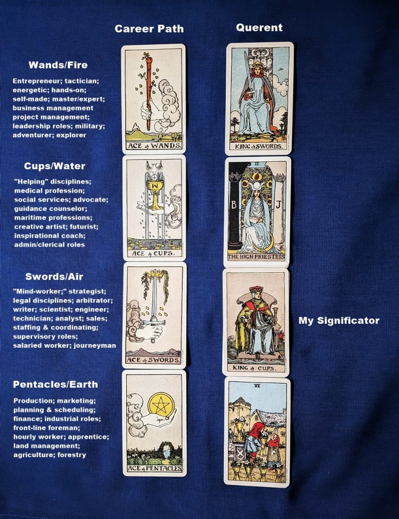 AUTHOR’S NOTE: While answering a career-related question in one of the online tarot communities, I was inspired to develop a spread that is based on “matching” between one of four elemental “career-path” cards and the querent’s significator. It’s not exactly a process of elimination; call it a “process of affiliation.”