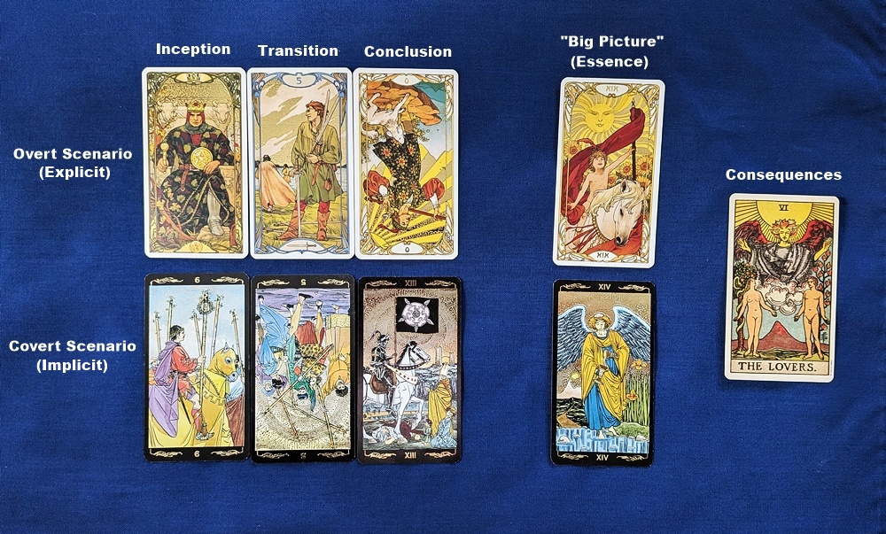 The “overt” scenario starts from a solid footing (or should we say “sitting”) with the upright King of Pentacles: everything is under control . . . until it isn’t, with the elementally-hostile 5 of Swords showing disruption and turmoil. The reversed Fool at the end implies being tossed off a cliff or maybe being “thrown to the wolves.” The Sun as the “Big Picture” card gives the impression that nothing too unpleasant will happen, and that any distress will be temporary and easily dispelled.