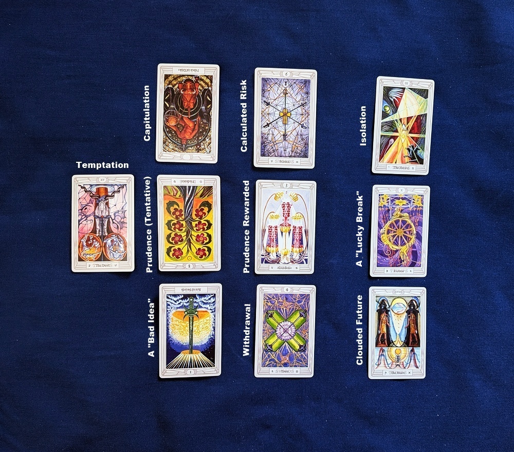The “Long-Range Consequences” of mishandling the risk attached to the Devil’s offer would be the seclusion of the Hermit, not the hoped-for romantic liaison since the Hermit is a much more retiring Earth card than either the Devil or the reversed Prince of Disks. Spinning the Wheel of Fortune as a result of deferring action on the opportunity could upgrade the emotional benefits shown by the 3 of Cups to a more stimulating level. (I treat the Wheel as generally positive in accordance with its traditional meaning.) The Moon puts an exclamation point on the realization that engaging with the Devil even for the purpose of rebuffing him would reap nothing but woe since it would almost certainly invite retribution. Best to stay far away.