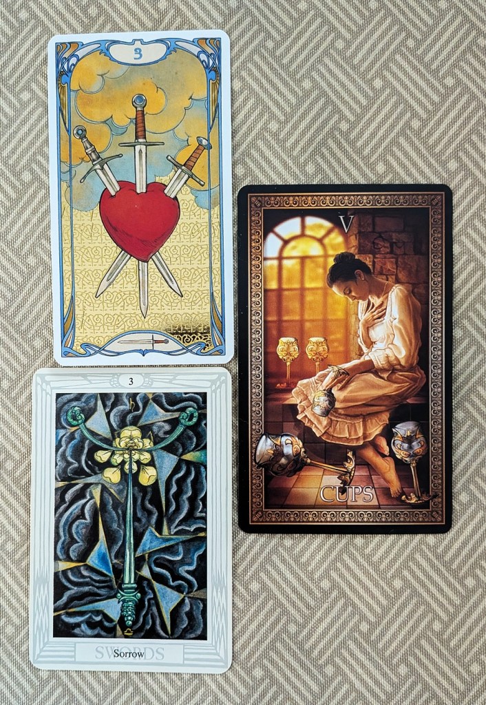I’ve always viewed the pierced heart on this card (and the dismembered rose on the Thoth version) as a “red herring” that is automatically assumed to mean that the seeker is (or will be) traumatized in the wake of a heart-wrenching emotional experience. But the suit of Swords (and its traditional element, Air) is the realm of cognitive perception and communication that promotes “thinking” over “feeling,” so to me this card suggests mental distress that can range from uneasiness to debilitating anxiety. (It is usually transitory since Air is volatile and Three is not a number with a lot of “staying-power.”) In past conversations, other readers have described the scene as implying “malicious gossip” or at most fierce disagreements and vigorous arguments. But I’ve just had an epiphany in that same vein.