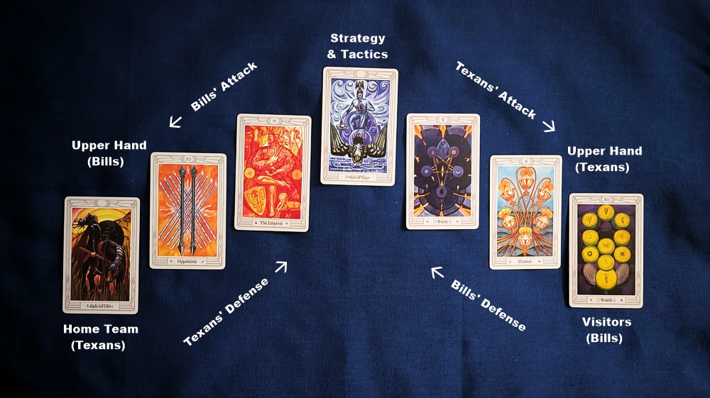 AUTHOR’S NOTE: Here I’m applying my new “Weaponized Relationship” spread to predict the outcome of an NFL football game. I’m not trying to determine the scoring, just which team will dominate the flow and therefore win the game. The Texans are hosting the Bills in Houston, so before drawing the cards I intentionally established them as Team #1 in the lower-left position, with the Bills as Team #2 at the lower-right. I’m using the “Weapon” card at the top-center to describe the likely complexion of the game in terms of strategies and tactics for the contest as a whole.