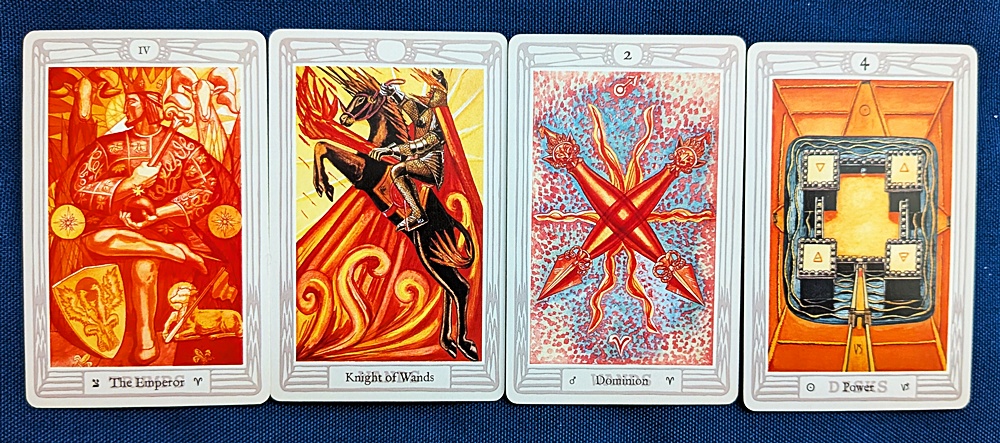 Judgement (Thoth Aeon) is the “primal” trump card of elemental Fire, and it was previously mated with the Ace of Wands. The 4 of Wands (Completion; Venus in Aries), seems like a valid addition because it can be envisioned as Aleister Crowley’s “Final decision in respect of the past,” one definition of his Aeon card, that is superseded by his “new current in respect of the future” when the angelic trumpet blows to summon the souls of the faithful.