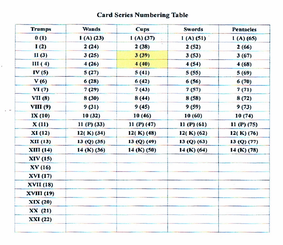 Using the table of numerical midpoints, find the card that sits midway between the top two randomly-drawn cards. This card represents the “adjusted” answer reflecting how the querent can “meet the Universe half-way” in working out a success path. Note that the midpoint might straddle two cards (for example, the 3 and 4 of Cups as highlighted in the table); in such cases, either choose the one that seems most appropriate to the context of the question or include both in the analysis (as I did in the example reading).