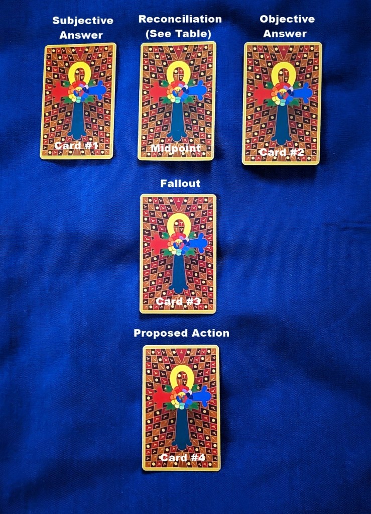 This approach uses the cards in a positive-reinforcement way that focuses on the desired outcome, and recognizes that the outlook the seeker hopes to receive (the “Subjective Answer”) may be different from the forecast offered by the Universe (the “Objective Answer”). This necessitates a reconciliation between the two (provided by the numerical midpoint table shown below), producing consequential “fallout” that invites a response in the form of proposed action or inaction. This recommendation will either affirm the objective or indicate the need for discretion when pursuing the opportunity.