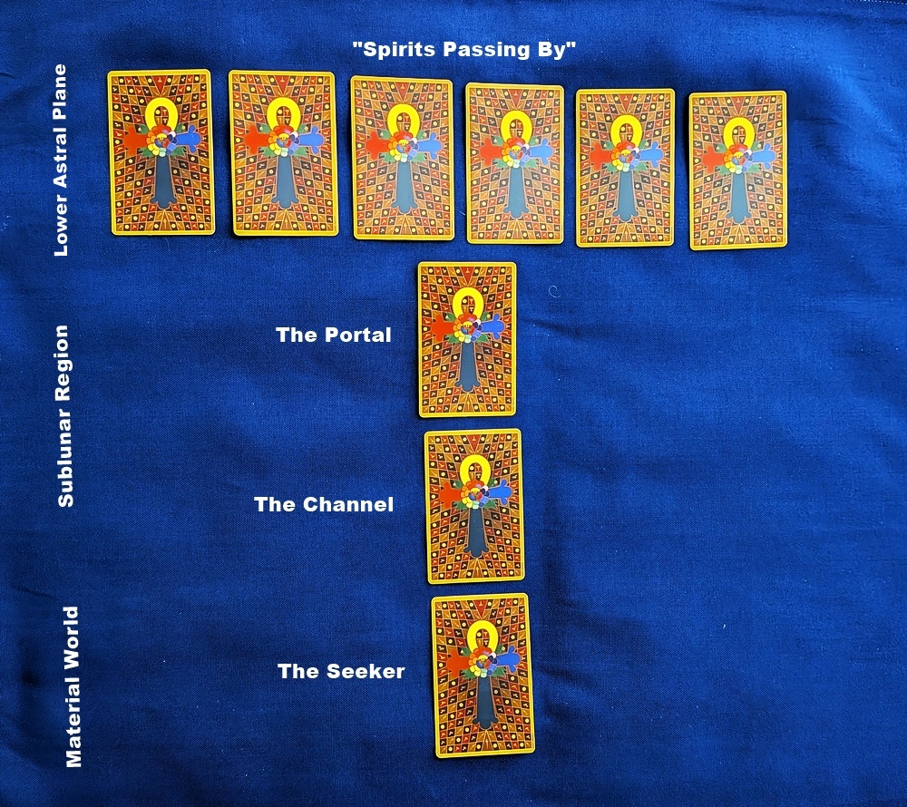 Turn the “Portal” card and the “Channel” card face-up to show the condition of the psychic pathway by which the communication will take place. (As an aside. Medieval theologians and philosophers believed the “sublunar” [below-the-Moon] region of space was the domain of spirits and lesser angels, which reminds me of “running the gauntlet” when performing spiritual work in the Lower Astral.)