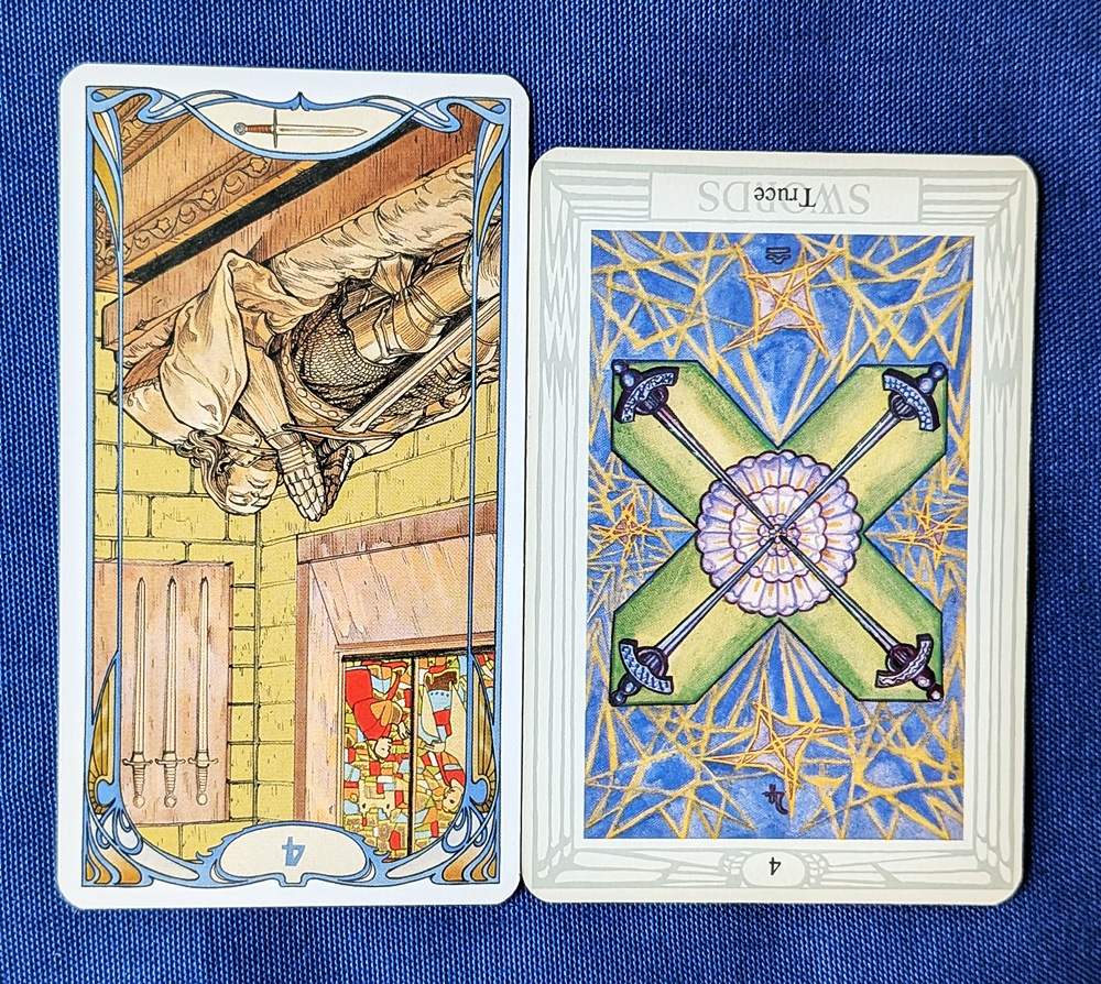 A more useful reference for my purpose here is Pandora’s Box. When the coffin is overturned, a variety of inconvenient realizations can enter the matter at hand, and we must hold them at arm’s length so they don’t attempt to coax us into doing (or thinking) something we would rather not. The title of “Truce” for the Thoth version is suggestive of ways in which we might do so, but one of them isn’t denial. The flip side of “rest after struggle” (the usual upright meaning) is “ongoing unrest” and in military terms a truce is an uneasy pause in hostilities while negotiations take place. Perhaps the reversal means that reconciliation of our hopes and fears must ensue to reinstate stability (one of the hallmarks of the Fours) before we can achieve a more lasting period of peaceful recovery.