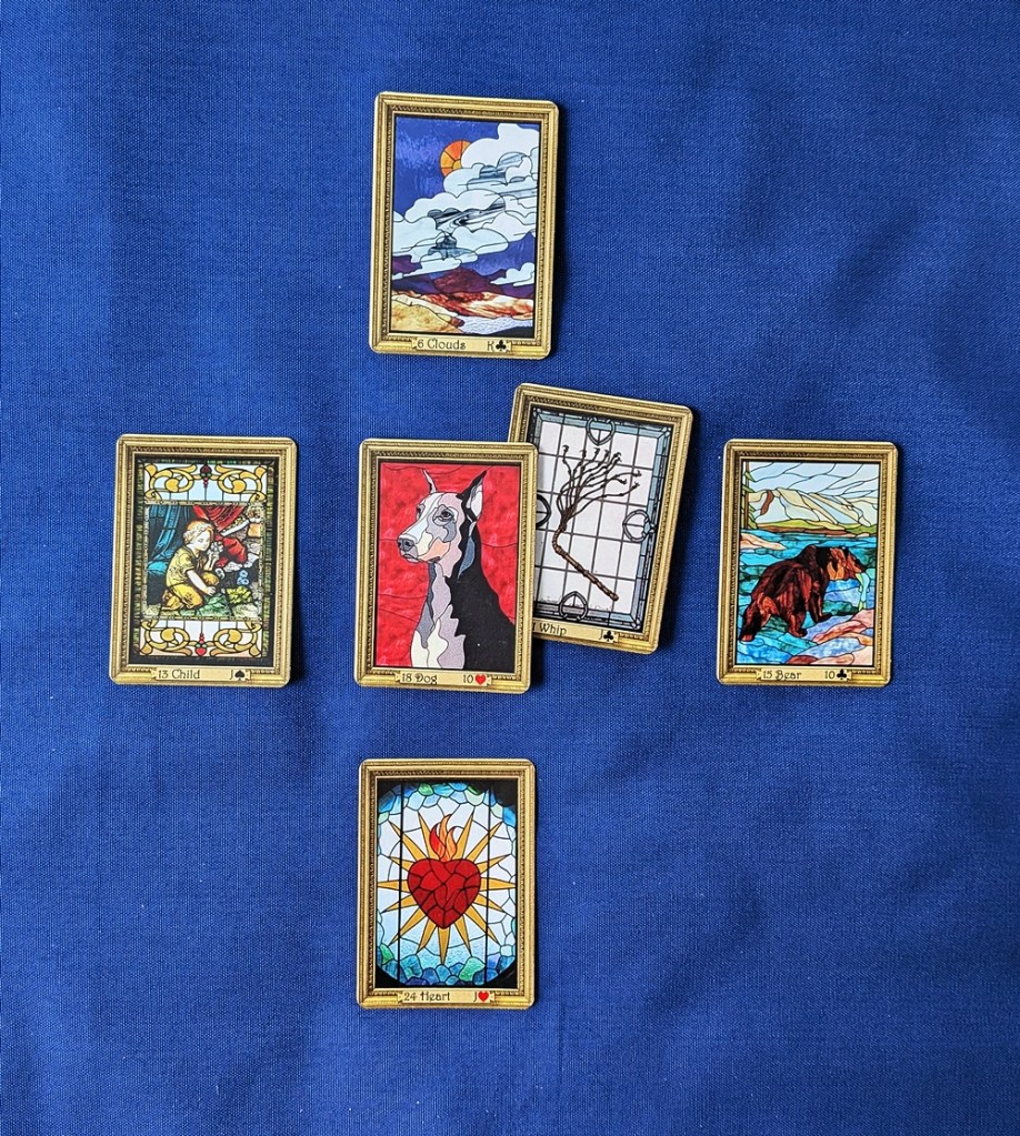I’ve been scolded by the online Lenormand community for my apostasy in venturing beyond the traditional spreads that originated in the 18th Century, but that hasn’t stopped me from continuing my experimentation. The cards are a wonderful resource that will speak the truth no matter how they are configured, and my goal is to find the most efficient ways to capitalize on that fact. The Grand Tableau will always be my favorite Lenormand layout, followed by the nine-card square, but sometimes I just want a basic forecast without the usual in-depth analysis that is still self-sufficient in its completeness. The three-card and five-card lines have their uses, but they are a bit too one-dimensional for my purpose. Here I’ve adapted the central “cross” structure of the GT and introduced an underlying sixth card.