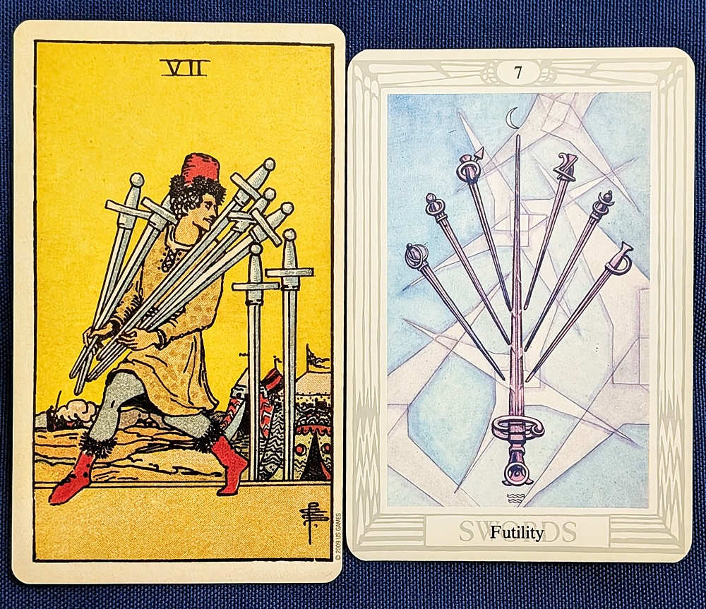AUTHOR’S NOTE: Many tarot readers find malice or deception in the Waite-Smith 7 of Swords, but I see mainly avoidance. The notions of an underhanded plan and potential theft almost certainly stem from the man’s sly expression, his furtive body language and the fact that he has been “caught in the act” with an armful of stolen swords; he is obviously up to no good. But this is one of those cards that we tend to over-think; even Waite acknowledged that “the significations are widely at variance with each another” (meaning that no two of his sources agreed on their import).