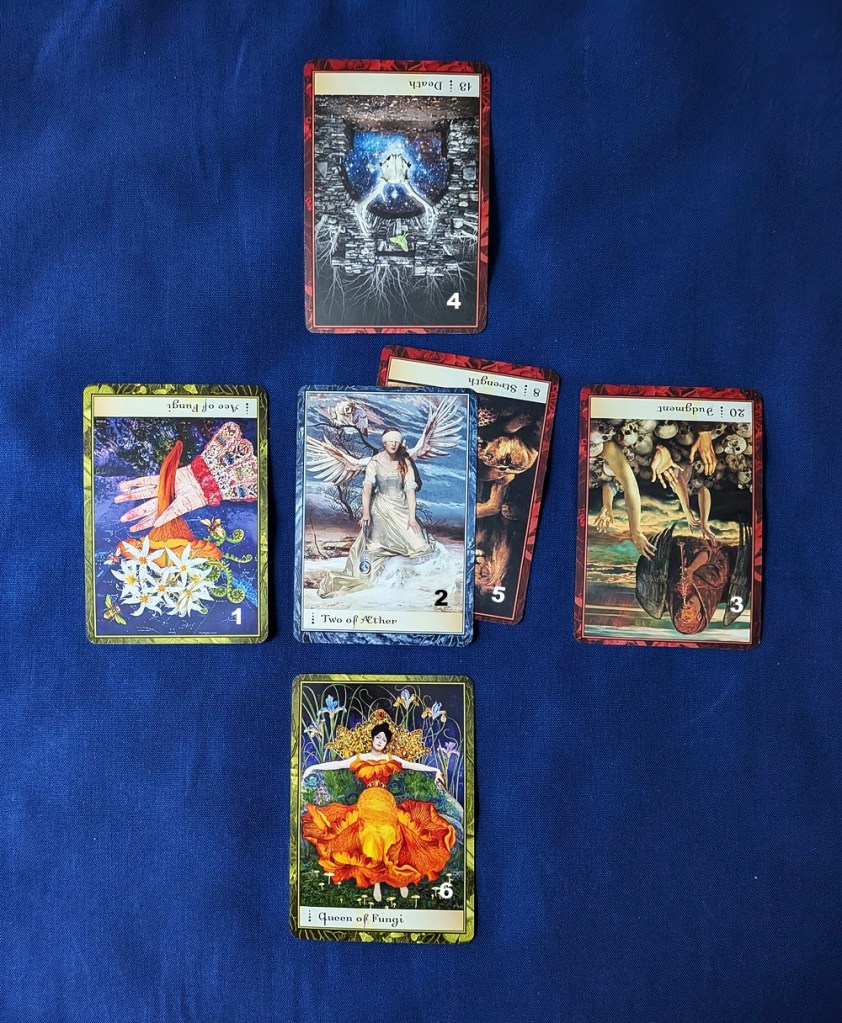 AUTHOR’S NOTE: I’ve now been sick with the flu for over two weeks since our family Christmas party in mid-December and decided to do a reading about what my remaining recovery period looks like. I used the beautiful Boadicea’s Tarot of Earthly Delights for this not-so-delightful situation, with its suits of “Combustion” (Fire); “Tentacles” (Water); “Aether” (Air); and “Fungi” (Earth).
