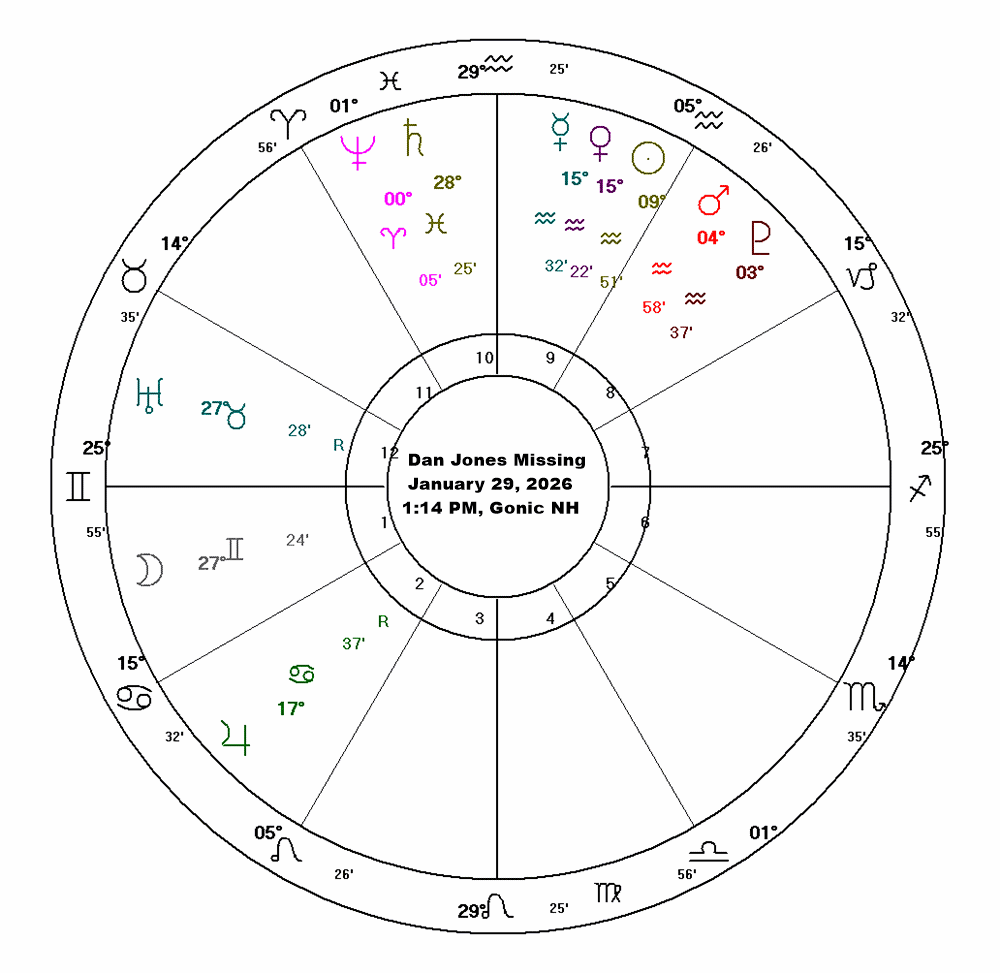 AUTHOR’S NOTE: Although there is little background information online other than a police-department request for community assistance, Dan Jones (apparently of Alexandria, NH) has been missing since December 1, 2025 in increasingly frigid weather. I performed a horary astrology reading followed by two tarot readings to see what I might learn about his current situation. (As you may know, a horary reading is performed at the astrologer’s geographic location for the precise instant the question is understood.)