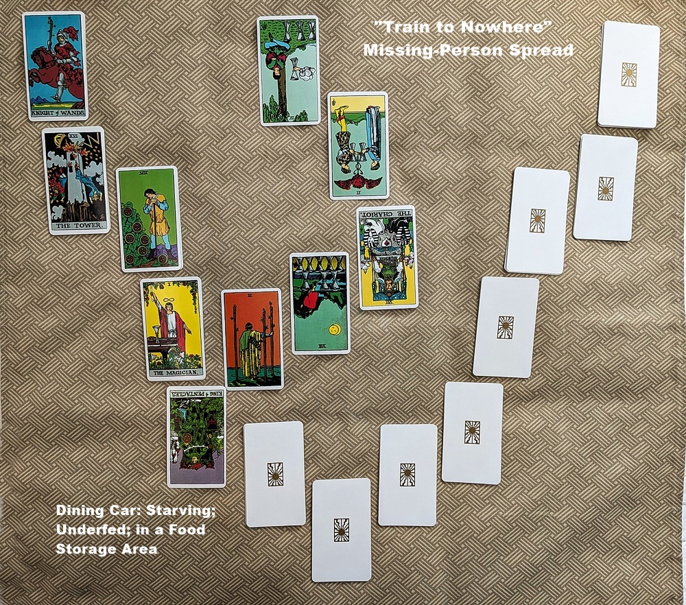 I chose the King of Pentacles to represent Dan because, based on the published photo, his dark hair and beard remind me of an Earth-sign type. In the random pull, this card came up reversed in the fifth position of the “Train to Nowhere” missing-person spread, a frame of reference I’ve labeled the “Dining Car,” implying that his disappearance is somehow related to lack of physical (and possibly emotional) sustenance.