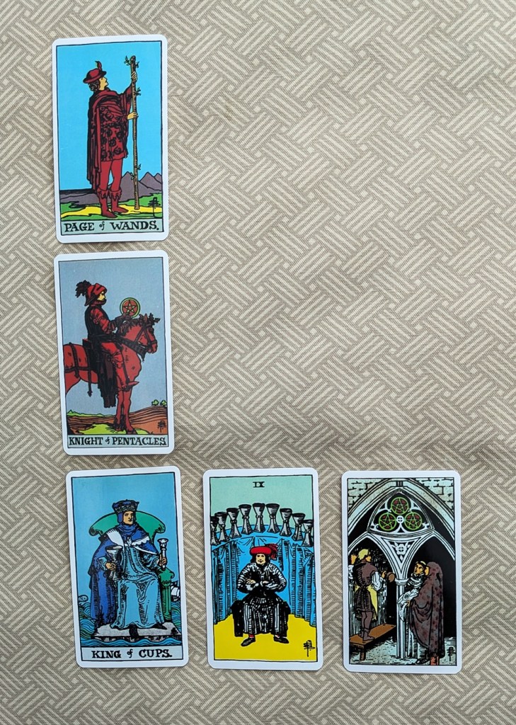 As a follow-up, I performed my “World of Hurt” missing-person spread. In this layout, the first court-card of the correct rank (in this case King) to show up in the draw identifies which of five circumstances the missing subject is experiencing. (The spread is linked below.)